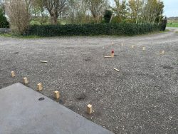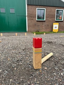 Plaatsing: Zet het speelveld uit (ongeveer 5×8 meter). Aan beide kanten van het veld staan vijf houten blokken (kubbs).